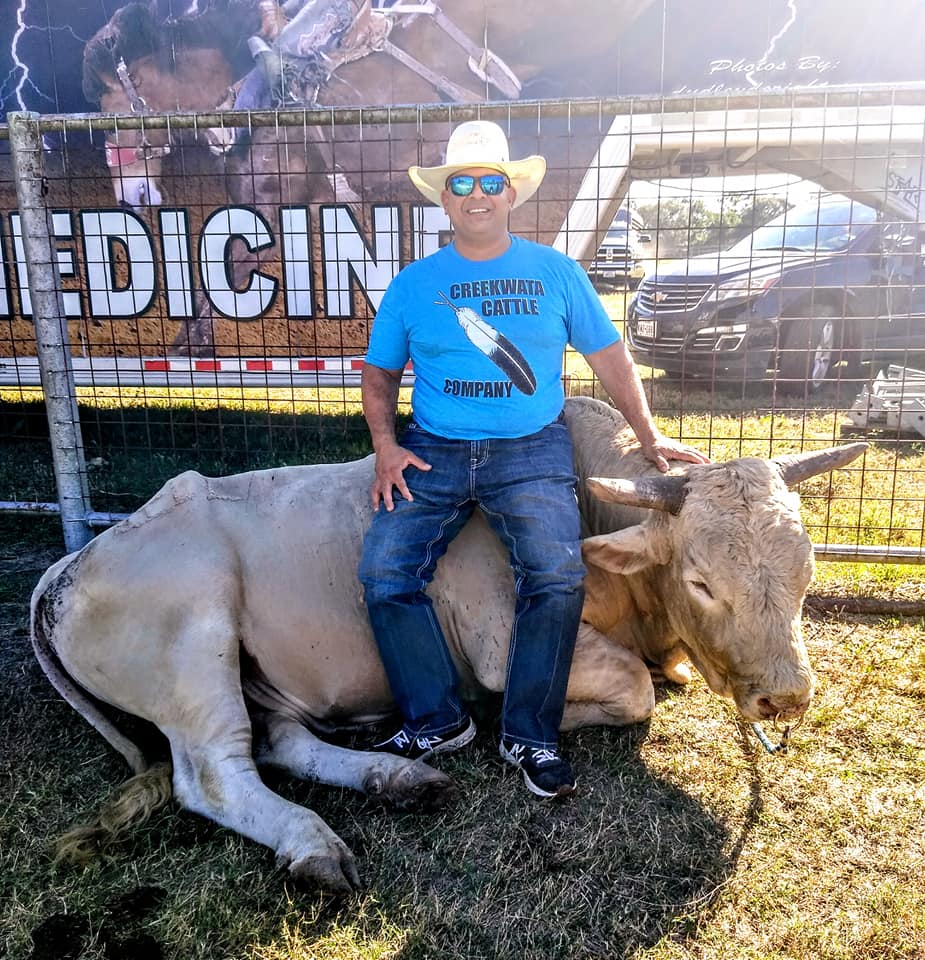 SETO Smiley sittin' on SETO Bill in his Creekwata Cattle Co tee. Ridin' for the brand.