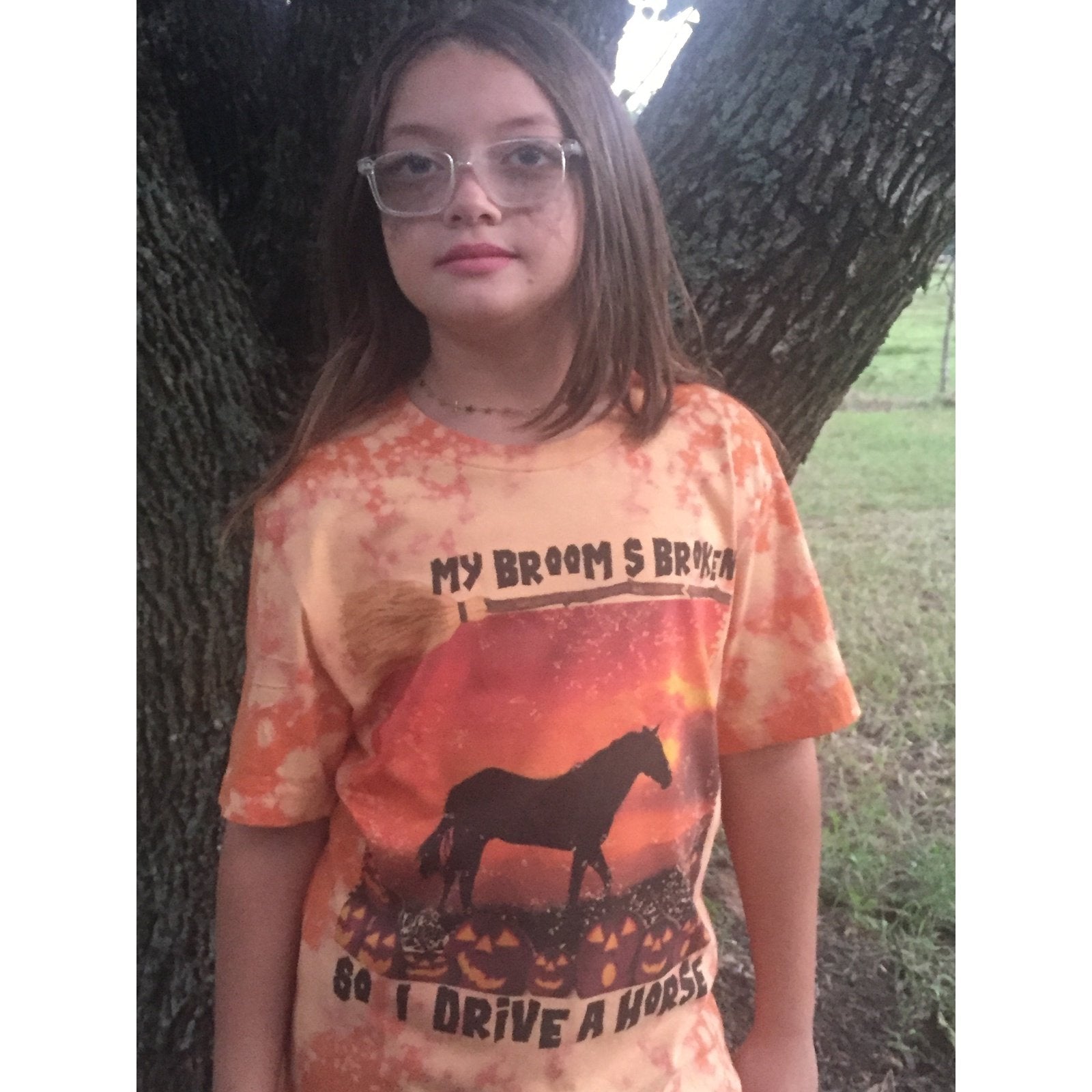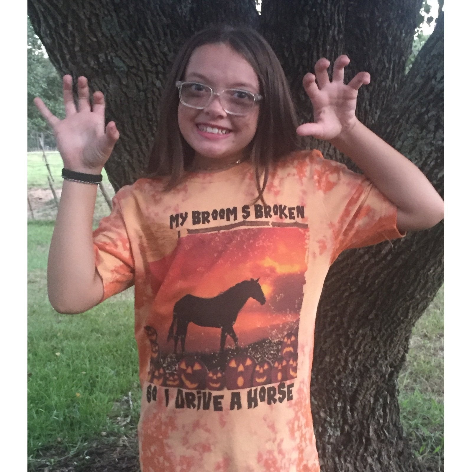My broom's broken so I ride a horse. This is the perfect Halloween tee for all the cowgirls around the world. This is a unisex tee, please refer to sizing chart before ordering. This tee is hand bleached and may very slightly from photo.